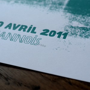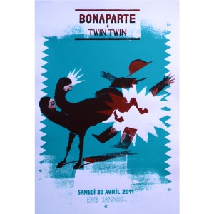 Affiche en sérigraphie de Renovigo, 2 couleurs pour le concert (annulé) de Bonaparte et Twin Twin à L'EMB le 30 Avril 2011.